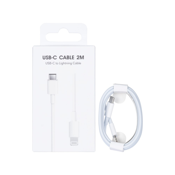 كابل USB-C إلى Lightning بطول 2 متر، أبيض اللون، بغلاف PVC، معبأ في علبة بيع بالتجزئة. كابل متوافق يوفر اتصالات آمنة للشحن ونقل البيانات مع أجهزة ابل، مصمم للاستخدام اليومي الموثوق.