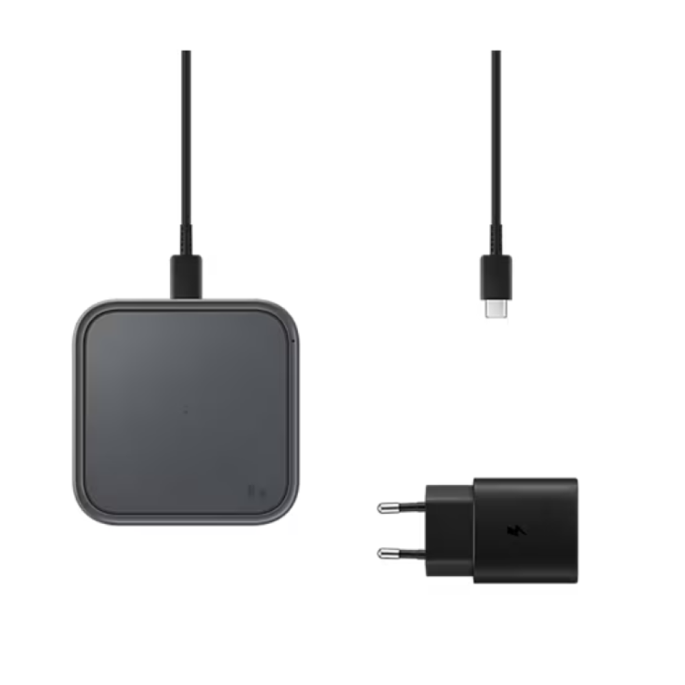 قاعدة شحن لاسلكية سوداء رفيعة مزودة بمنفذ USB-C. سطح متوافق مع تقنية Qi للشحن بدون أسلاك، وقاعدة مانعة للانزلاق، ونظام تحكم حراري لشحن سريع وآمن؛ مثالية لوضعها على المكتب أو بجانب السرير.