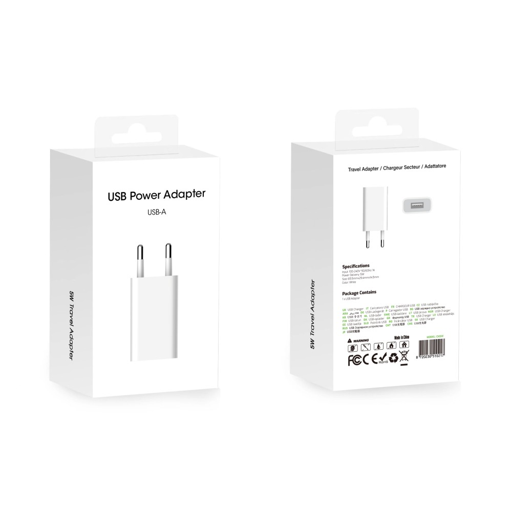 محول طاقة USB-A بقوة 5 واط، أبيض اللون. شاحن حائط CH5W صغير الحجم يوفر خرجًا ثابتًا بقوة 5 واط لشحن الأجهزة الأساسية؛ تصميم بسيط، هيكل متين، وميزات أمان.
