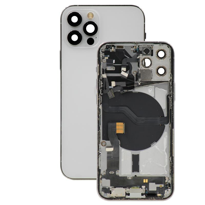 غطاء خلفي كامل مع جميع الأجزاء الصغيرة، باستثناء البطارية والكاميرا الخلفية، فضي اللون؛ متوافق مع ايفون 12 برو (A2407/A2341/A2406/A2408).