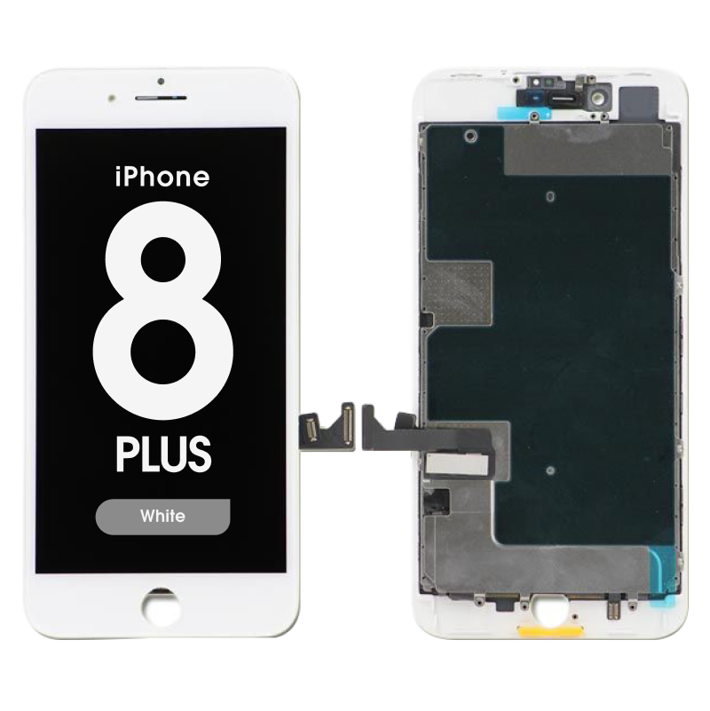 شاشة متوافقة مع هاتف آيفون 8 بلس من فئة Super Retina / Retina، بإطار أبيض، تشمل الإطار؛ تُعيد وظيفة اللمس والعرض. التوافق: آيفون 8 بلس (A1864/A1898/A1899/A1897).