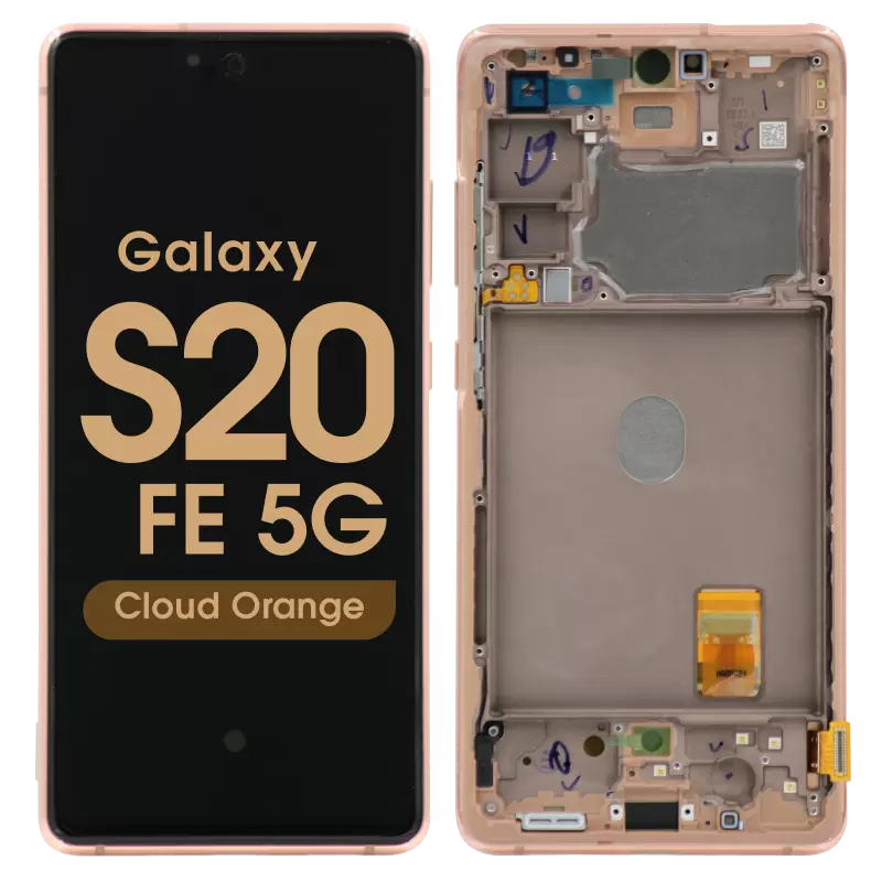 شاشة Super AMOLED كاملة مقاس 6.5 بوصة بدقة 1080x2400 ومعدل تحديث 120 هرتز مع إطار لهاتف جلاكسي S20 FE؛ لون برتقالي سحابي؛ جودة حزمة الخدمة.
