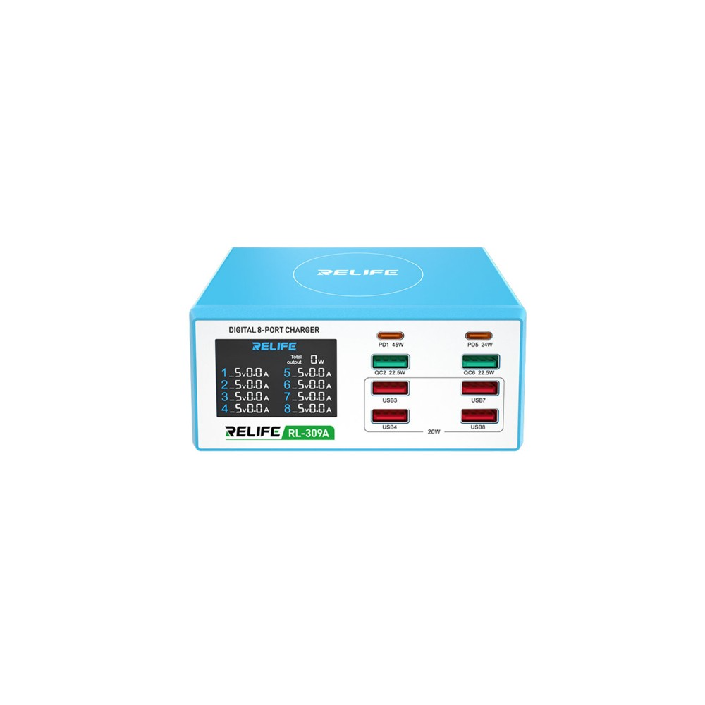 شاحن بثمانية منافذ مزود بشاشة عرض لشحن الأجهزة بكفاءة.