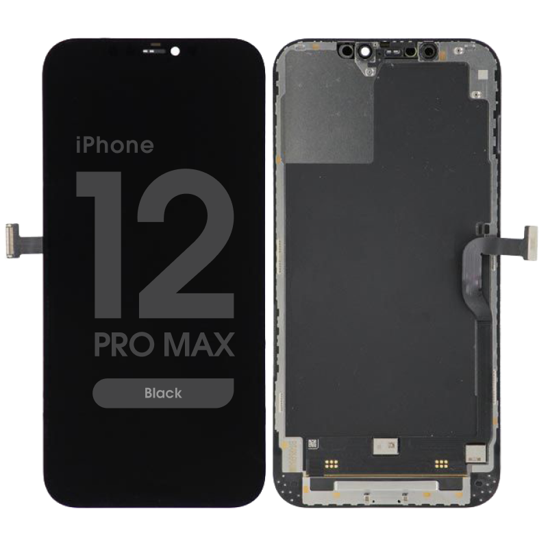Pulled Super Retina XDR OLED display assembly, 1284×2778, includes frame; restores OLED display and touch. Compatibility: iPhone 12 Pro Max (A2342/A2410/A2411/A2412).
