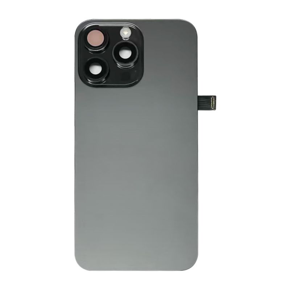 Complete rear housing with all small parts, excludes battery and back camera; Black Titanium finish; compatible with iPhone 15 Pro Max (A2849/A3105/A3106/A3108).