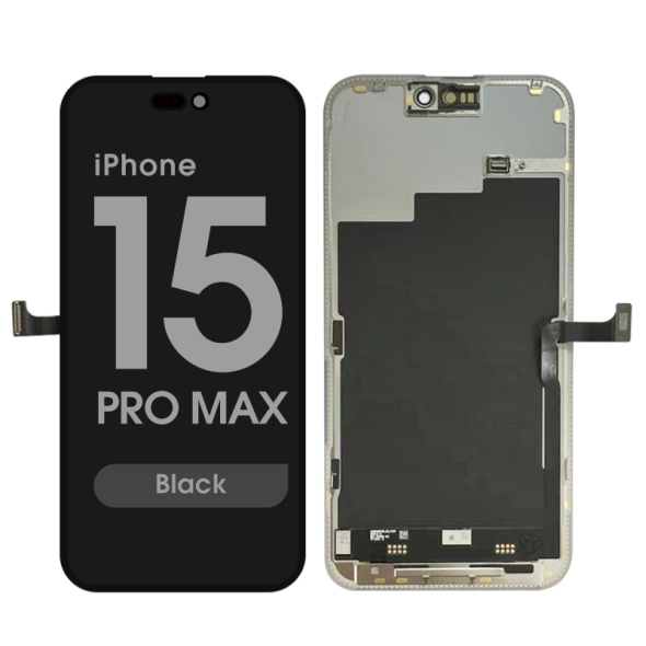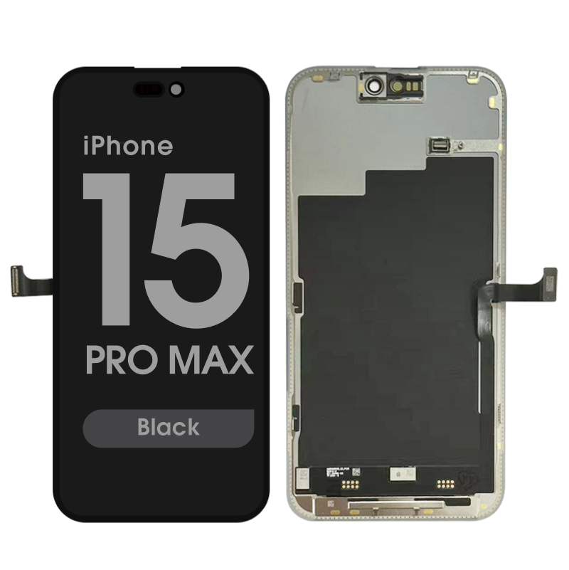 Refurbished LTPO Super Retina XDR OLED display assembly, 120Hz, HDR10/Dolby Vision; includes frame; restored and tested, True Tone rewrite may be limited. Compatibility: iPhone 15 Pro Max.