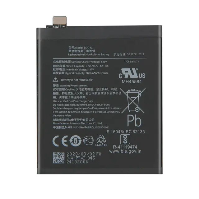Compatible Li‑Po battery BLP743 compatible with OnePlus 7T; non-removable cell manufactured to original specifications for capacity and fast charging.
