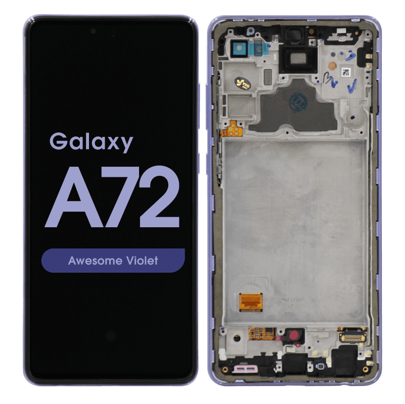 Super AMOLED 6.7" 90Hz 1080x2400 complete display with frame for Galaxy A72 SM‑A725 in purple; soft OLED quality.