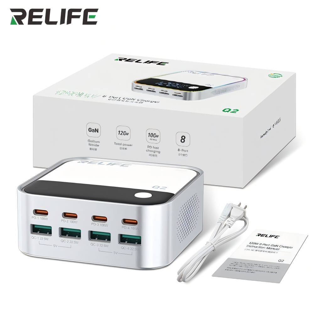 120W GaN 8‑port charger with smart power distribution and safety protections.